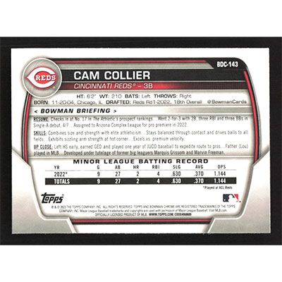 This is a 2023 Bowman Chrome Draft Cam Collier baseball card. The card is #BDC-143 and pictures show condition.
