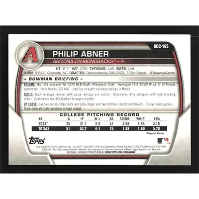 This is a 2023 Bowman Chrome Draft Philip Abner baseball card. The card is #BDC-165 and pictures show condition.