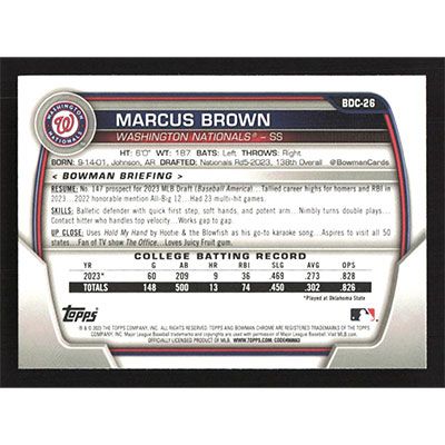 This is a 2023 Bowman Chrome Draft Marcus Brown baseball card. The card is #BDC-26 and pictures show condition.