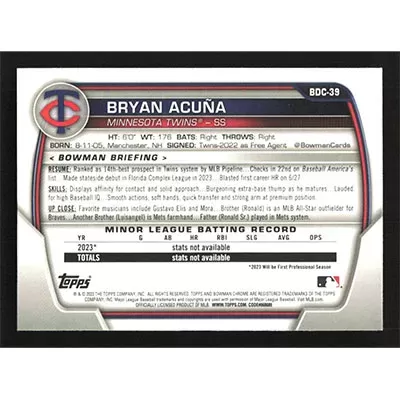 This is a 2023 Bowman Chrome Draft Bryan Acuña baseball card. The card is #BDC-39 and pictures show condition.