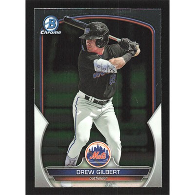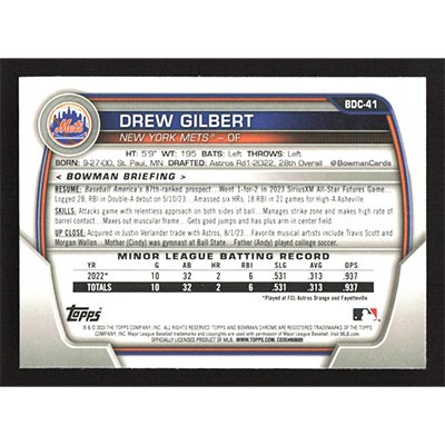 This is a 2023 Bowman Chrome Draft Drew Gilbert baseball card. The card is #BDC-41 and pictures show condition.