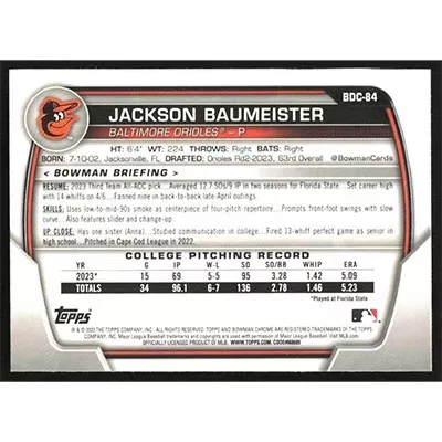 This is a 2023 Bowman Chrome Draft Jackson Baumeister baseball card. The card is #BDC-84 and pictures show condition.