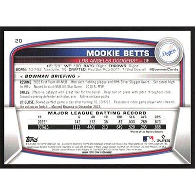 This is a 2023 Bowman Chrome Mega Box Green Refractors Mookie Betts baseball card. The card is #20 and pictures show condition. This card is limited; #'d 94/99.