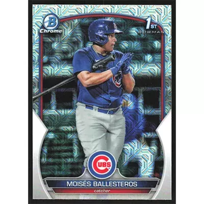 This is a 2023 Bowman Chrome Mega Box Prospects Moises Ballesteros baseball card. The card is #BCP-11 and pictures show condition.