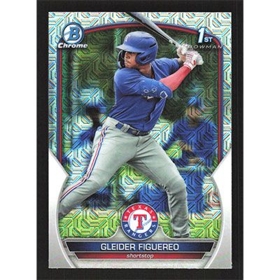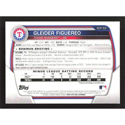 This is a 2023 Bowman Chrome Mega Box Prospects Gleider Figuereo baseball card. The card is #BCP-59 and pictures show condition.