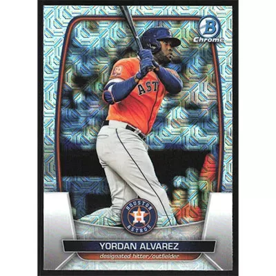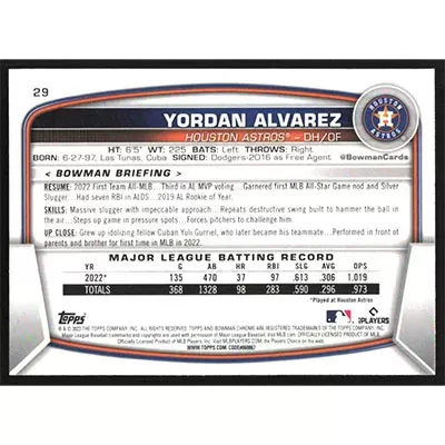 This is a 2023 Bowman Chrome Mega Box Refractors Yordan Alvarez baseball card. The card is #29 and pictures show condition.