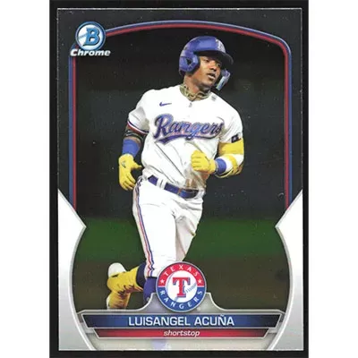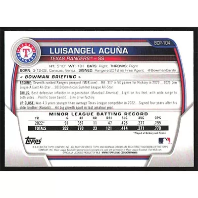 This is a 2023 Bowman Chrome Prospects Luisangel Acuña baseball card. The card is #BCP-104 and pictures show condition.