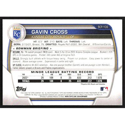 This is a 2023 Bowman Chrome Prospects Gavin Cross baseball card. The card is #BCP-109 and pictures show condition.
