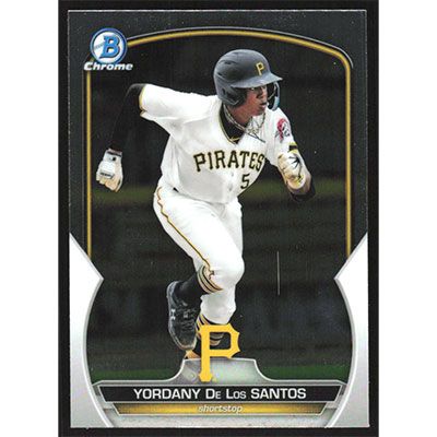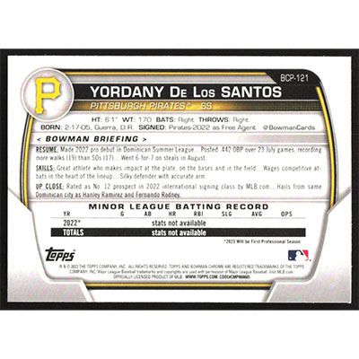 This is a 2023 Bowman Chrome Prospects Yordany De Los Santos baseball card. The card is #BCP-121 and pictures show condition.