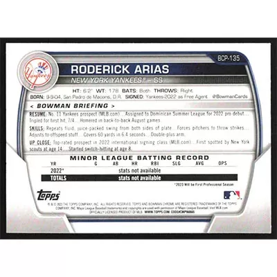 This is a 2023 Bowman Chrome Prospects Roderick Arias baseball card. The card is #BCP-135 and pictures show condition.