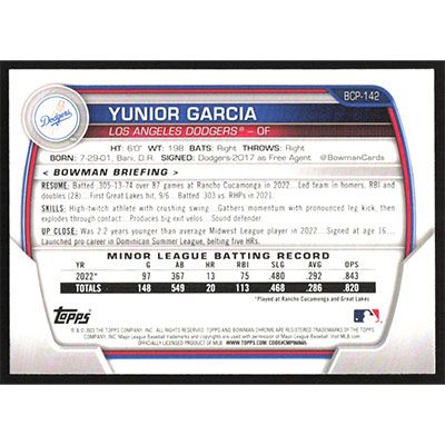 This is a 2023 Bowman Chrome Prospects Yunior Garcia baseball card. The card is #BCP-142 and pictures show condition.
