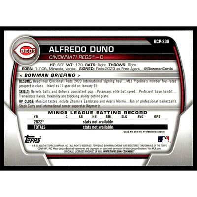 This is a 2023 Bowman Chrome Prospects Alfredo Duno baseball card. The card is #BCP-238 and pictures show condition.
