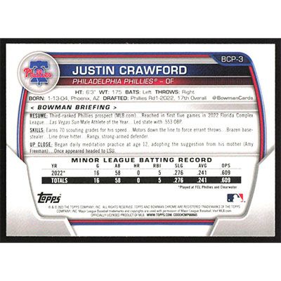 This is a 2023 Bowman Chrome Prospects Justin Crawford baseball card. The card is #BCP-3 and pictures show condition.