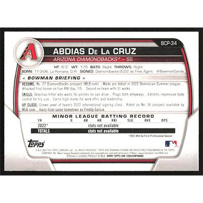 This is a 2023 Bowman Chrome Prospects Abdias De La Cruz baseball card. The card is #BCP-34 and pictures show condition.