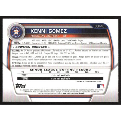 This is a 2023 Bowman Chrome Prospects Kenni Gomez baseball card. The card is #BCP-40 and pictures show condition.
