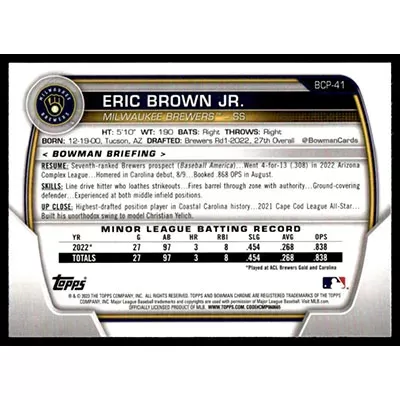 This is a 2023 Bowman Chrome Prospects Eric Brown Jr. baseball card. The card is #BCP-41 and is in NM-MT condition.