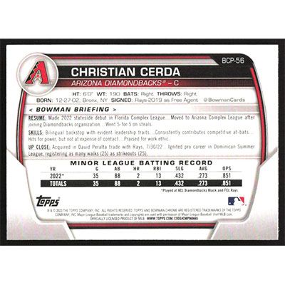 This is a 2023 Bowman Chrome Prospects Christian Cerda baseball card. The card is #BCP-56 and pictures show condition.