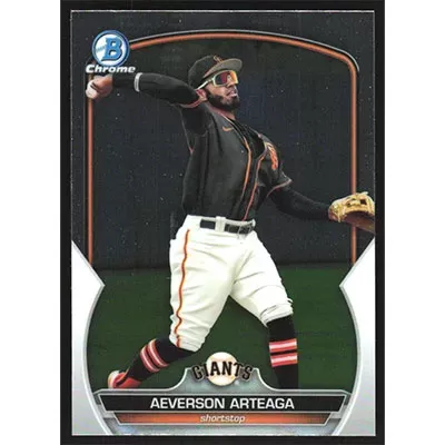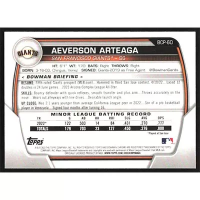 This is a 2023 Bowman Chrome Prospects Aeverson Arteaga baseball card. The card is #BCP-60 and pictures show condition.