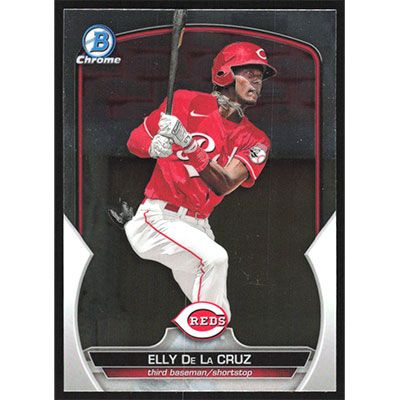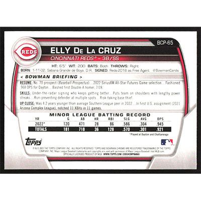 This is a 2023 Bowman Chrome Prospects Elly De La Cruz baseball card. The card is #BCP-65 and pictures show condition.