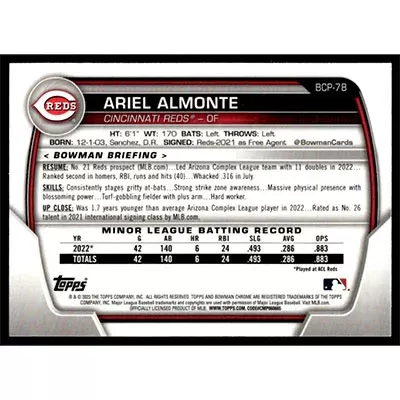 This is a 2023 Bowman Chrome Prospects Ariel Almonte baseball card. The card is #BCP-78 and pictures show condition.
