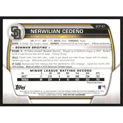 This is a 2023 Bowman Chrome Prospects Nerwilian Cedeno baseball card. The card is #BCP-81 and pictures show condition.