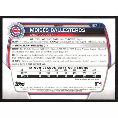 This is a 2023 Bowman Chrome Prospects Lunar Glow Refractors Moises Ballesteros baseball card. The card is #BCP-11 and pictures show condition. Team(s): Chicago Cubs