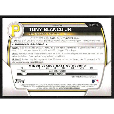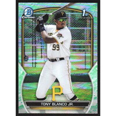 This is a 2023 Bowman Chrome Prospects Lunar Glow Refractors Tony Blanco Jr. baseball card. The card is #BCP-134 and pictures show condition. Team(s): Pittsburgh Pirates
