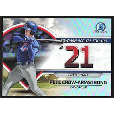 This is a 2023 Bowman Chrome Scouts Top 100 Pete Crow-Armstrong baseball card. The card is #BTP-21 and pictures show condition.