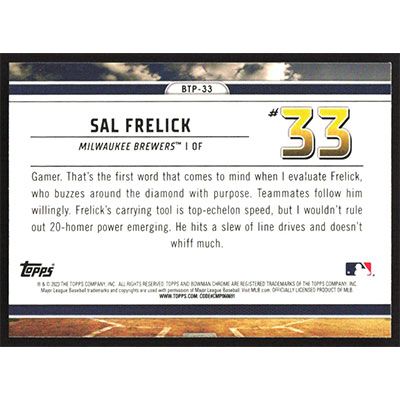 This is a 2023 Bowman Chrome Scouts Top 100 Sal Frelick baseball card. The card is #BTP-33 and pictures show condition.