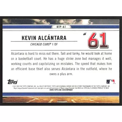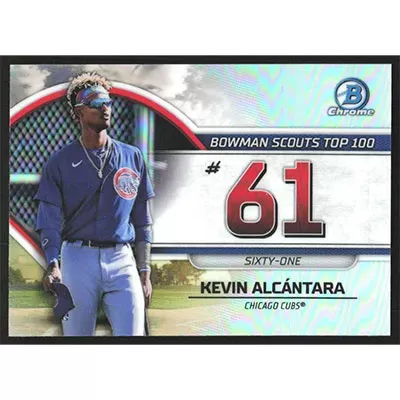 This is a 2023 Bowman Chrome Scouts Top 100 Kevin Alcantara baseball card. The card is #BTP-61 and pictures show condition.