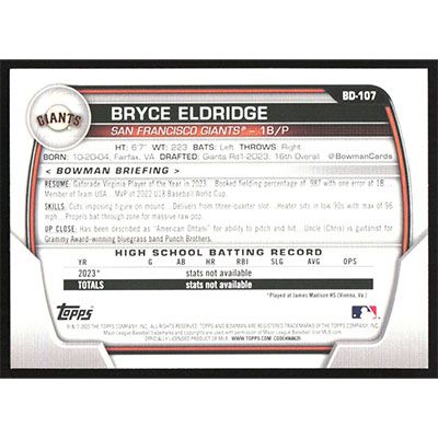This is a 2023 Bowman Draft Bryce Eldridge baseball card. The card is #BD-107 and pictures show condition.