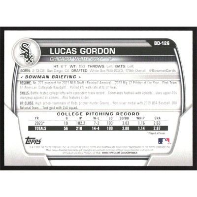 This is a 2023 Bowman Draft Lucas Gordon baseball card. The card is #BD-126 and pictures show condition.