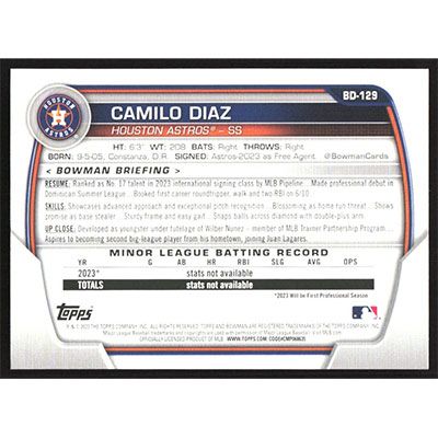 This is a 2023 Bowman Draft Camilo Diaz baseball card. The card is #BD-129 and pictures show condition.