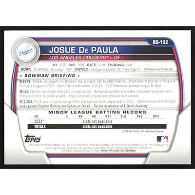 This is a 2023 Bowman Draft Josue De Paula baseball card. The card is #BD-132 and pictures show condition.
