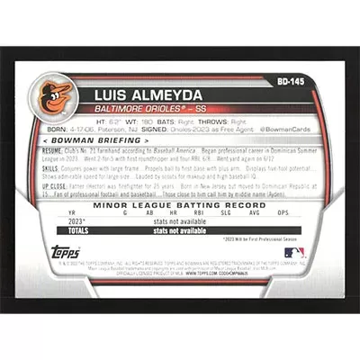 This is a 2023 Bowman Draft Luis Almeyda baseball card. The card is #BD-145 and pictures show condition.