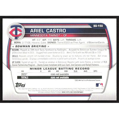 This is a 2023 Bowman Draft Ariel Castro baseball card. The card is #BD-150 and pictures show condition.