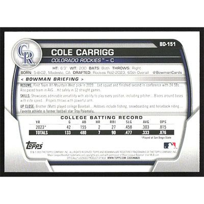 This is a 2023 Bowman Draft Cole Carrigg baseball card. The card is #BD-151 and pictures show condition.