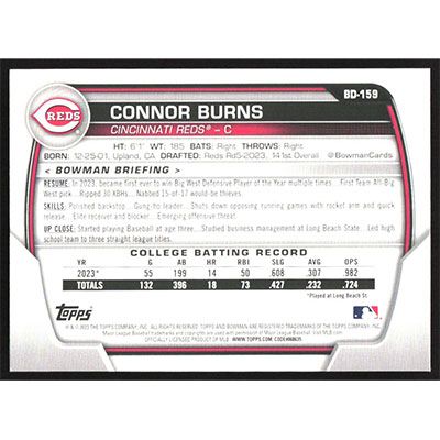 This is a 2023 Bowman Draft Connor Burns baseball card. The card is #BD-159 and pictures show condition.