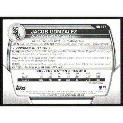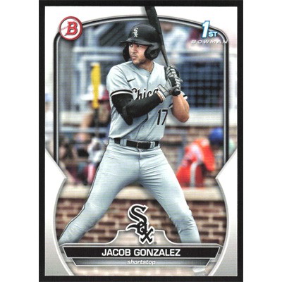 This is a 2023 Bowman Draft Jacob Gonzalez baseball card. The card is #BD-167 and pictures show condition.