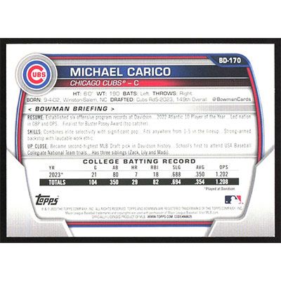 This is a 2023 Bowman Draft Michael Carico baseball card. The card is #BD-170 and pictures show condition.
