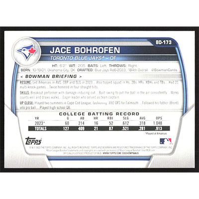 This is a 2023 Bowman Draft Jace Bohrofen baseball card. The card is #BD-173 and pictures show condition.