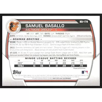 This is a 2023 Bowman Draft Samuel Basallo baseball card. The card is #BD-179 and pictures show condition.
