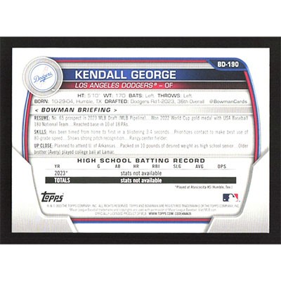 This is a 2023 Bowman Draft Kendall George baseball card. The card is #BD-190 and pictures show condition.