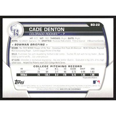 This is a 2023 Bowman Draft Cade Denton baseball card. The card is #BD-22 and pictures show condition.