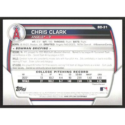 This is a 2023 Bowman Draft Chris Clark baseball card. The card is #BD-31 and pictures show condition.