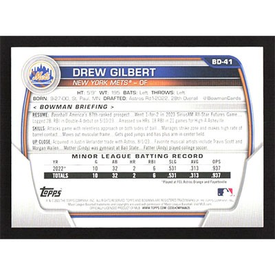 This is a 2023 Bowman Draft Drew Gilbert baseball card. The card is #BD-41 and pictures show condition.