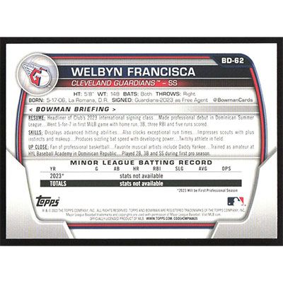 This is a 2023 Bowman Draft Welbyn Francisca baseball card. The card is #BD-62 and pictures show condition.