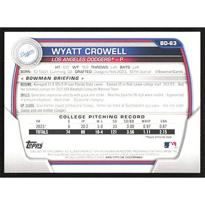 This is a 2023 Bowman Draft Wyatt Crowell baseball card. The card is #BD-63 and pictures show condition.