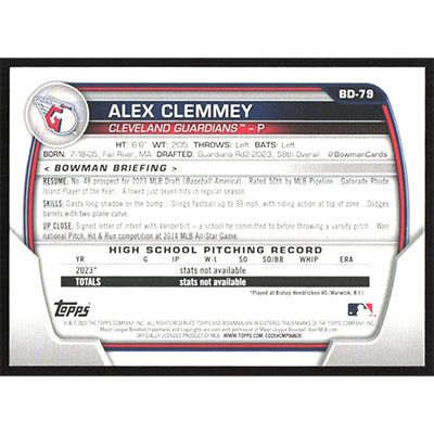 This is a 2023 Bowman Draft Alex Clemmey baseball card. The card is #BD-79 and pictures show condition.