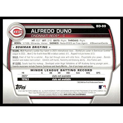 This is a 2023 Bowman Draft Alfredo Duno baseball card. The card is #BD-99 and pictures show condition.